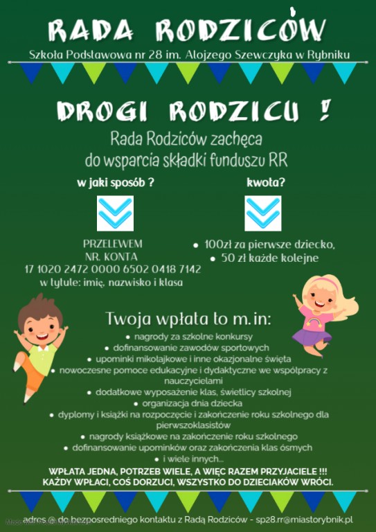 Drodzy Rodzice / Opiekunowie!Przypominamy o wpłatach na fundusz Rady Rodziców –wszystkie informacje znajdą Państwo na załączonym poniżej plakacie oraz na stronie szkoły w zakładce RODZICE - każda złotówka wspiera działania na rzecz naszych uczniów!Zachęcamy również do udziału w konkursie wpłat, zgodnie z informacjami zawartymi na przesłanym plakacie.Dziękujemy za Wasze zaangażowanie.Rada Rodziców SP 28