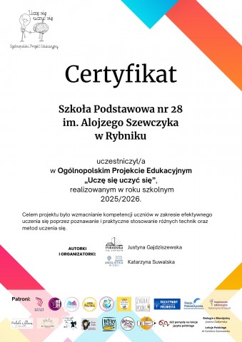 Z dumą informujemy, że nasza szkoła otrzymała certyfikat za udział w Ogólnopolskim Projekcie Edukacyjnym „Uczę się uczyć się”. Udział w projekcie był dla uczniów okazją do rozwijania umiejętności skutecznego uczenia się, organizowania pracy oraz budowania motywacji do zdobywania wiedzy.