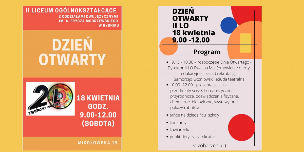 Dyrektor, nauczyciele oraz uczniowie II LO z Oddziałami Dwujęzycznymi im. A. Frycza Modrzewskiego w Rybniku serdecznie zapraszają młodzież wraz z rodzicami na DZIEŃ OTWARTY SZKOŁY, który odbędzie się 18 kwietnia 2026 r. (sobota) od 9.00 do 12.00.